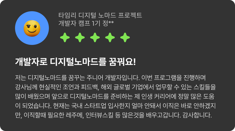 수강생 여러분들을 위해 가장 저렴한 가격으로 T.D.N.P에 입장할 수 있게 얼리버드 가격을 준비했습니다. 더 합리적인 가격으로 해외 개발자의 꿈을 향해 달려가세요!